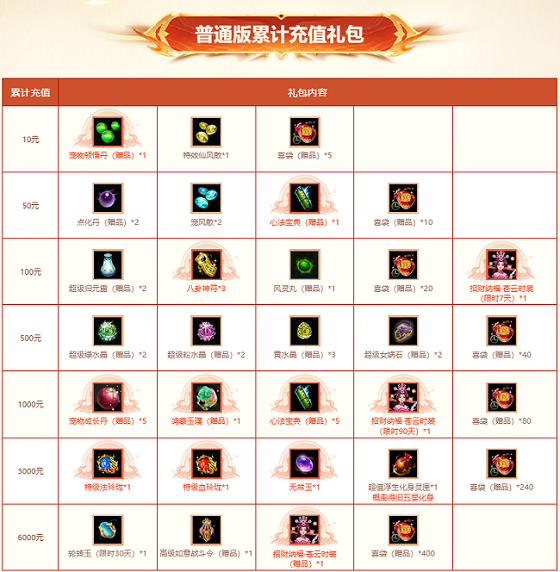 活动期间,普通版和经典版玩家累计充值达到10元、50元、100元、500元、1000元、3000元、6000元,即可获得对应的丰厚礼包奖励。累计充值满100元, 即可获赠限时7天的全新时装——招财纳福·苍云;累计充值满6000元,将会获得永久时装——招财纳福·苍云!其中喜袋数量也随着充值金额增加而增多,惊喜层层加码。
