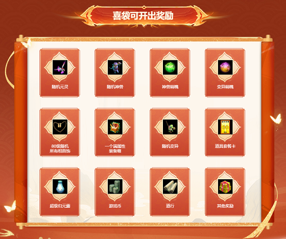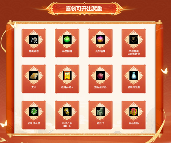 喜袋内含丰富奖励,普通版的道友有机会开出随机元灵(元灵从赤天、混沌、笛舞、降魔、夫诸、震魃中随机开出)、随机神兽、变异、神兽精魄、变异精魄、满属性装备箱、80级随机所有相首饰、道具套餐卡、商城道具、道行,游戏币等。