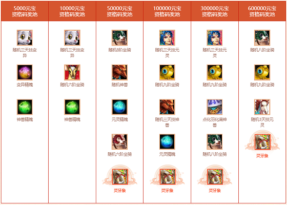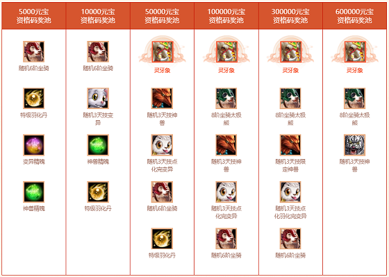 普通版玩家有机会赢得八阶坐骑灵牙象、随机八阶或九阶坐骑(仅至尊系列)、随机元灵、点化羽化满的神兽、随机变异等奖励。