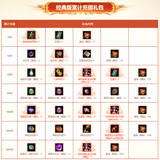 经典版的道友有机会开出随机神兽、神兽精魄、变异精魄、80级随机所有相首饰、道具套餐卡、商城道具,游戏币等。