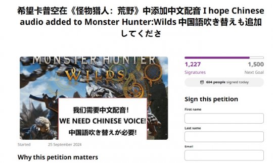 早在去年9月,游戏尚未发售之时,中国玩家便曾发起过请愿,希望官方添加中文配音。请愿理由则是:“作为一个中国玩家,我认为添加中文配音能够为中国玩家提供更好的游戏体验,打造一个更可供沉浸的世界观,并且也更有助于卡普空拓展中国市场。”