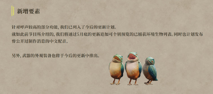 作为2025年最畅销的游戏之一,《怪物猎人:荒野》的首月销量已经达到了1000万份,创造了卡普空的历史之最。而关于游戏的更新工作也还在持续当中,日前官方已经确定,《怪物猎人:荒野》的中文配音将于5月底上线。