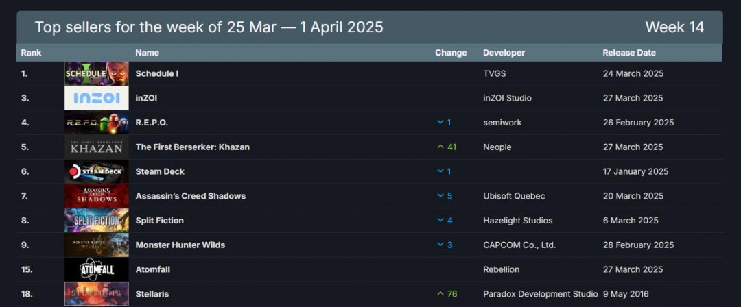 Steam 2025年最新一周游戏销量排行榜出炉(2025年3月25日-2025年4月1日,无免费游戏),本周有多款新作首发上榜,包括:《inZOI》、《第一狂战士:卡赞》、《原子陨落》。