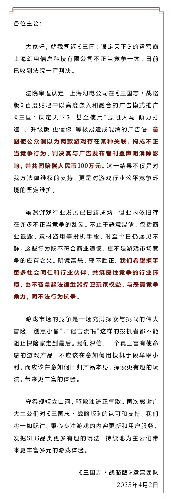 公告中提到:法院审理认定,上海幻电公司在《三国志?战略版》百度贴吧中以高度嵌入和融合的广告模式推广《三国:谋定天下》,并使用“原班人马 倾力打造”、“升级版 更懂你”等极易造成混淆的广告语,意图使公众误以为两款游戏存在某种关联,构成不正当竞争行为,判决其与广告发布者刊登声明消除影响,并共同赔偿人民币100万元