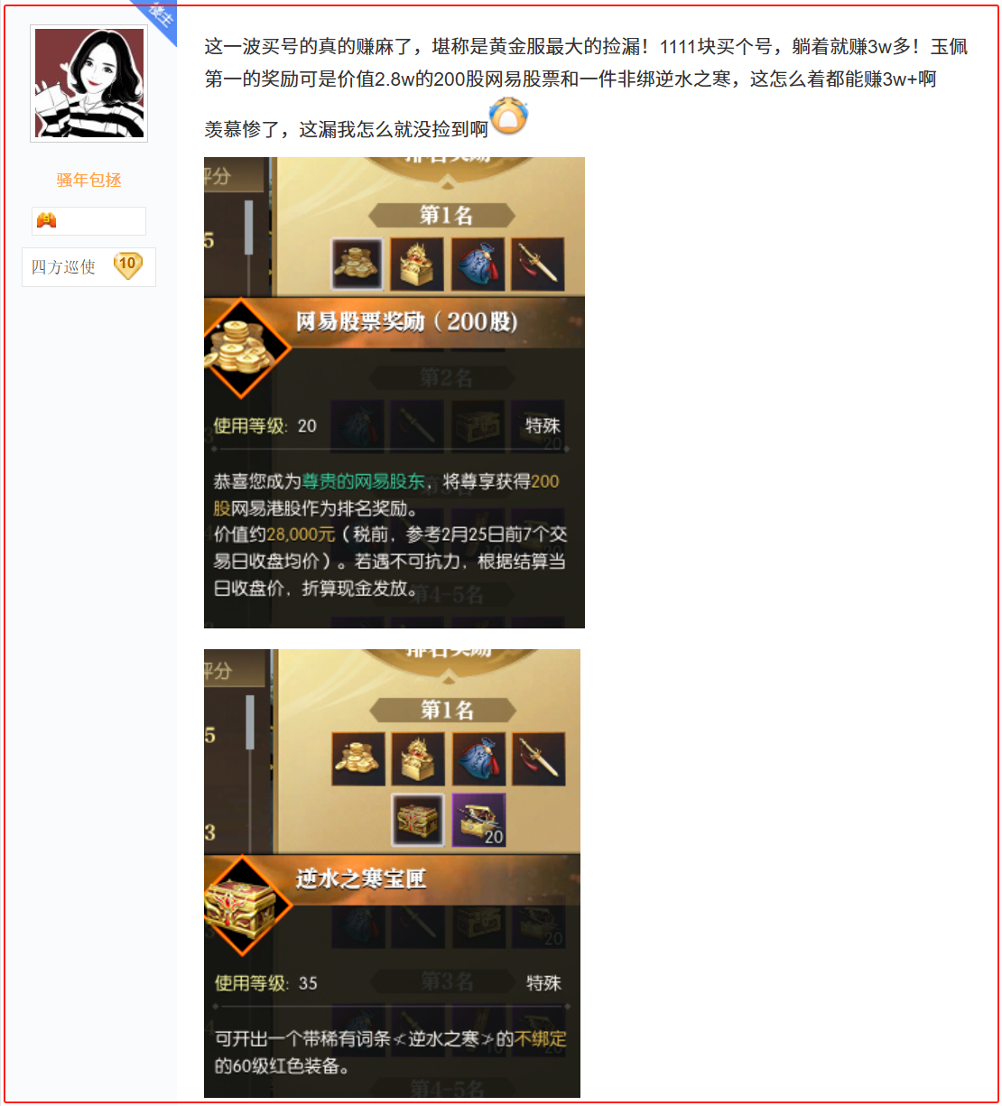 ¡¡¡¡±ÈÈçÓÐÍæ¼ÒÔÚ¼ø¶¨×Ô¼ºµÄ°ó¶¨ÓñʯµÄʱºò£¬¾ÍÒâÍ⿪³öÁË7´ÊÌõ¶¼ÓÐÓöøÇÒÊýÖµ¼«¸ßµÄ³¬¼«Æ·Óñʯ¡£ËûËæ¼´Ñ¡Ôñ¸ß¼ÛÂôºÅÂä´üΪ°²¡£¿ÉÈÃËûûÏëµ½µÄÊÇ£¬×Ô¼ºÕ˺ŸÕÂôµÚ¶þÌ죬»Æ½ð·þ¾Í¾Ù°ìÁË¡°½ºþÉñ±øÆ×¡±»î¶¯£¬¶øÂòËûÕ˺ŵÄÍæ¼Ò¾ÍÊÇÆ¾½èÕâ¿é¼«Æ·Óñʯ£¬Éñ±øÆ×°ñÉÏÓÐÃû£¬²»µ«»ñµÃÁËרÊô³ÆºÅ¡¢·Ç°óÄæË®Ö®º®×°±¸£¬»¹Äõ½ÁË200¹ÉÍøÒ×¸Û¹É¹ÉÆ±£¬¼ÛÖµÈËÃñ±ÒÊýÍòÔª¡£