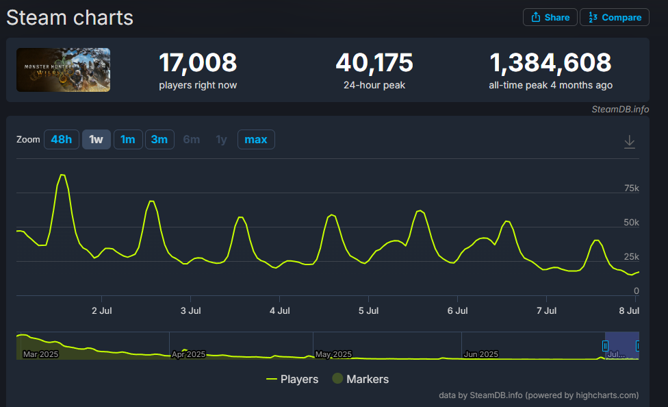 尽管卡普空的3A旗舰《怪物猎人:荒野》(峰值1,384,608)稳居榜首,但其发售后频遭诟病的性能问题也暴露了大厂困境,在线数骤减。其他上榜作品包括《天国:拯救2》(峰值256,206)和独立游戏《Bongo Cat》(峰值194,508)。