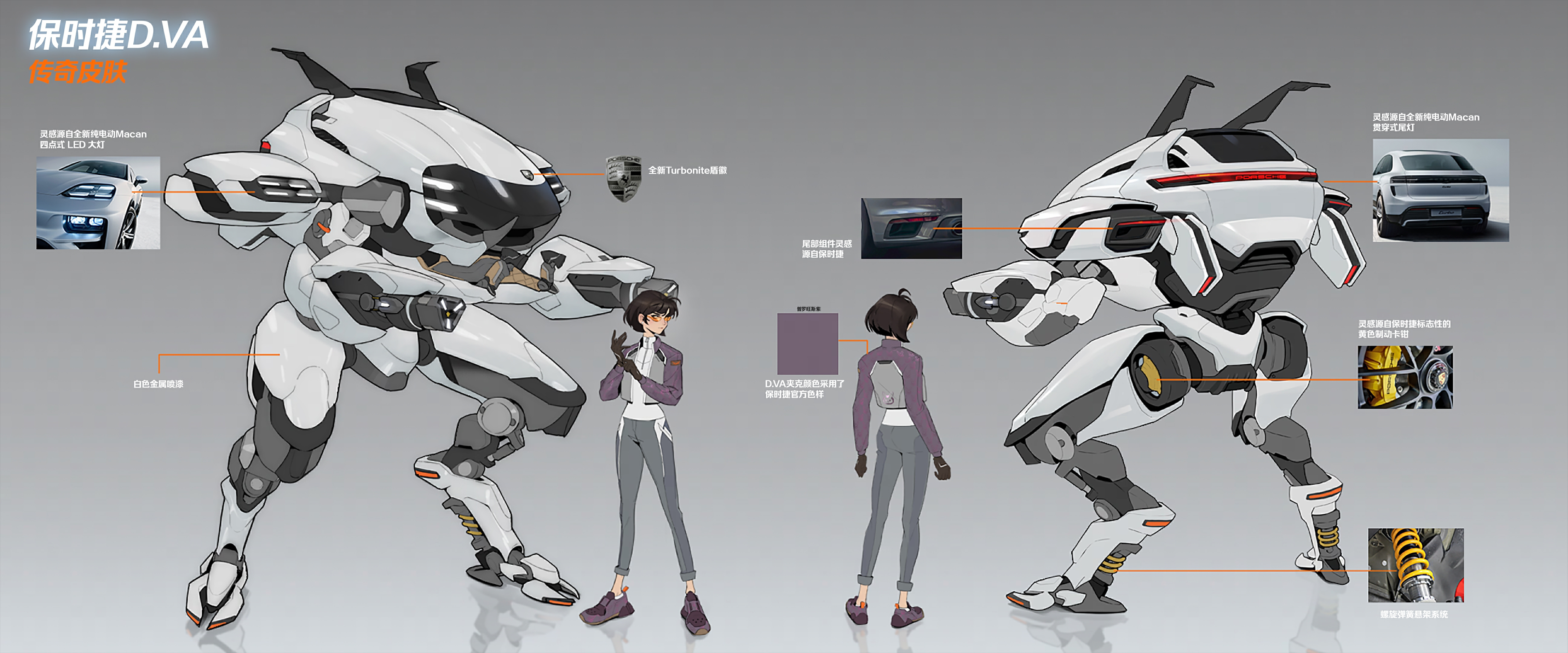 D.Va驾驶的全新机甲参考了纯电保时捷Macan Turbo的流线型设计,并结合了诸多其他设计要素。无论是全新Turbonite金属车标、白色金属喷漆、四点式LED大灯、贯穿尾灯,还是螺旋弹簧悬架系统、黄色制动卡钳、真皮内饰,都被融入进了全新皮肤的设计之中。返场的保时捷D.Va礼包内容丰富,不仅包含“疾速试驾”特写、“夜幕迅影”名牌、保时捷头像、“绝世好车”喷漆,还会附赠本赛季新增保时捷D.Va名牌。