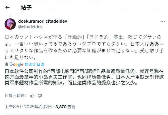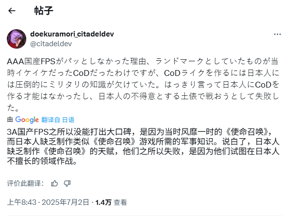 他在贴文中写道:“日本开发者本身以及其主要玩家群体,缺乏对于军事背景与历史的深入理解,试图复制《使命召唤》的‘酷感’和氛围,反而让游戏显得空洞。”