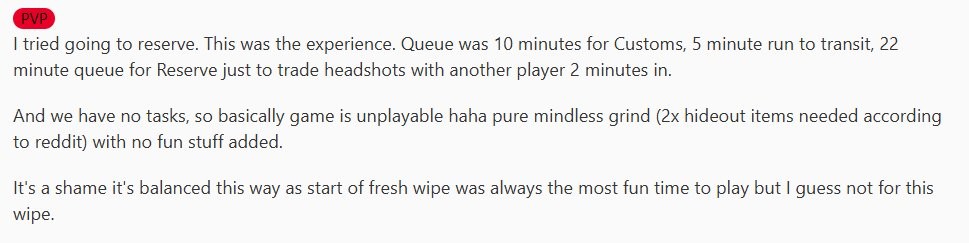 红迪用户SakeMadaMada写道:“我试着去‘储备站’。体验如下:排‘海关’花了10分钟,跑到转移点花了5分钟,排‘储备站’又排了22分钟,结果进去才两分钟就和另一个玩家对枪爆头了。”