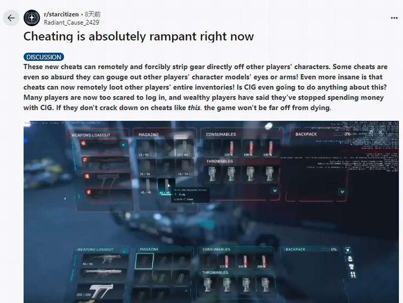 许多玩家反馈称,作弊问题已严重影响到游戏体验。据2025年7月初的报告描述,作弊者能远程清空同服务器其他玩家库存,导致部分高消费用户暂避游戏。此外还观察到自瞄、穿墙、无敌、穿模及物理操纵等传统作弊手段。