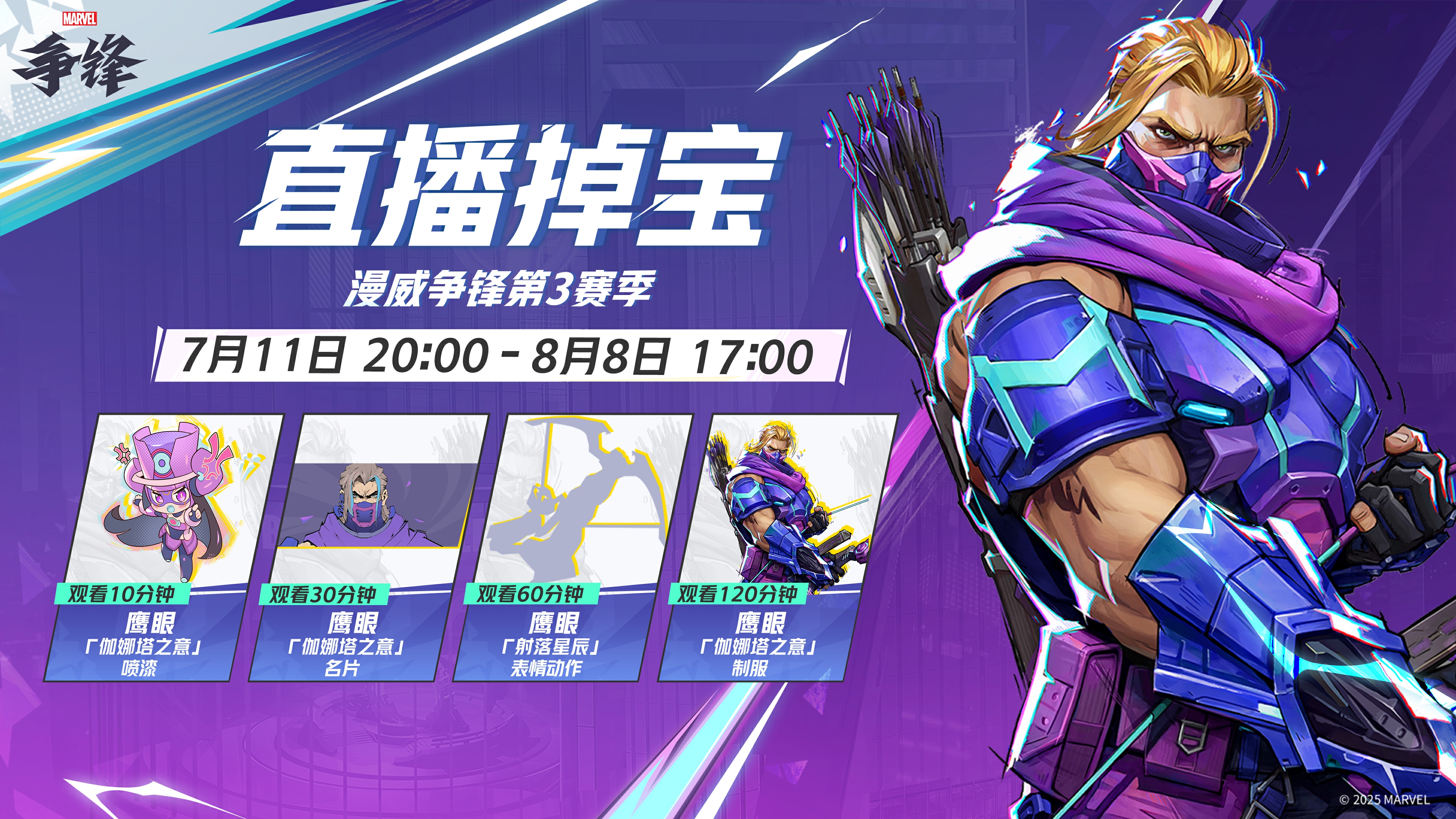 7月11日与《漫威争锋》第3赛季同步开启的还有全新的直播掉宝活动,在官方指定直播平台的《漫威争锋》专区观看直播,达成累积观看时长条件,便可免费领取包括鹰眼「伽娜塔之意」皮肤在内的多款外观道具,千万不要错过!