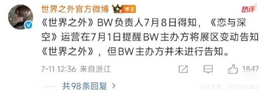 与此同时,《世界之外》官方在评论区中介绍称,《恋与深空》运营早在7月1日就提醒BW主办方将战区变动告知《世界之外》方,但BW主办方并未进行告知。