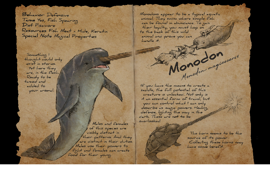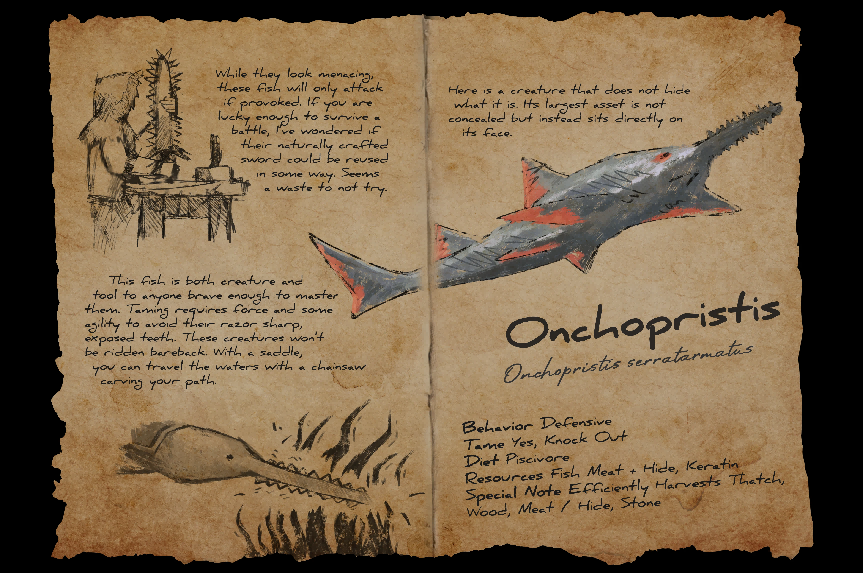 "对于敢于驯服它们的人来说,这种鱼既是生物,也是工具。驯服它们需要武力,还要足够敏捷来躲避它们锋利裸露的牙齿。这些生物不能赤背骑乘,必须装备鞍具。装备妥当后,你便能在水中畅游,用“电锯”劈开前方的道路。."
