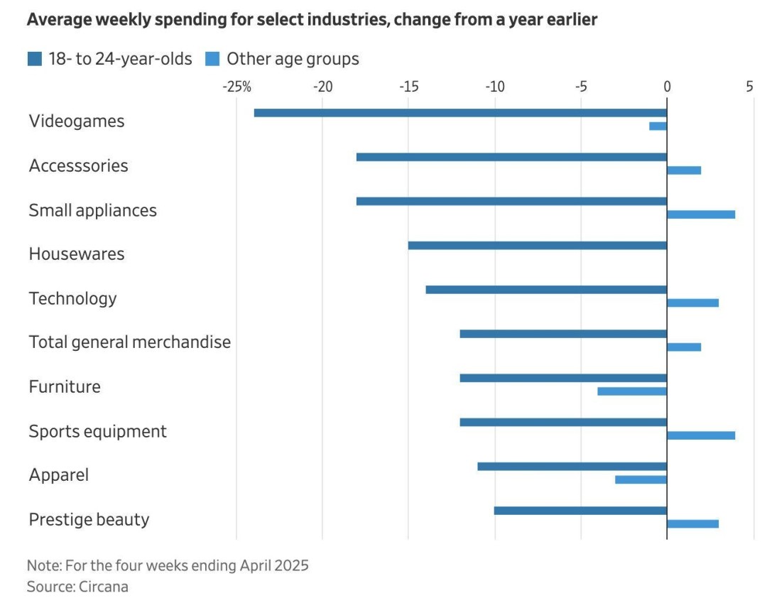 Circana的新数据显示,18至24岁的玩家在电子游戏上的购买支出同比减少了近25%,降幅超过其他任何年龄段。这一跌幅比科技产品、服装或配饰领域的下滑更为显著——这些领域同样出现了支出下降。