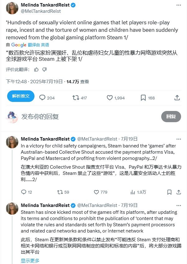 请愿书中提及的“激进组织影响”,明显指向自称促成Steam政策变更的非营利机构“Collective Shout”。在Steam下架多款成人游戏后,该组织联合创始人Melinda Tankard Reist在社交平台宣称,此举源于他们指控Steam支付商从暴力性内容中获利。她将下架结果称为“重大胜利”,并表示支持新规。