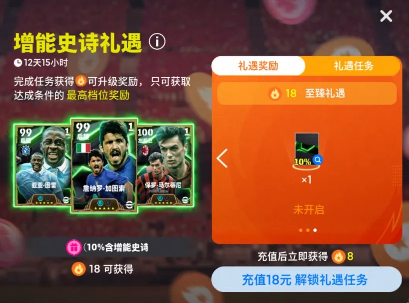 在【增能史诗礼遇】活动期间,玩家购买18元档位实况点卡后可获得7礼遇点数,并解锁礼遇任务,完成礼遇任务可继续获得礼遇点数。