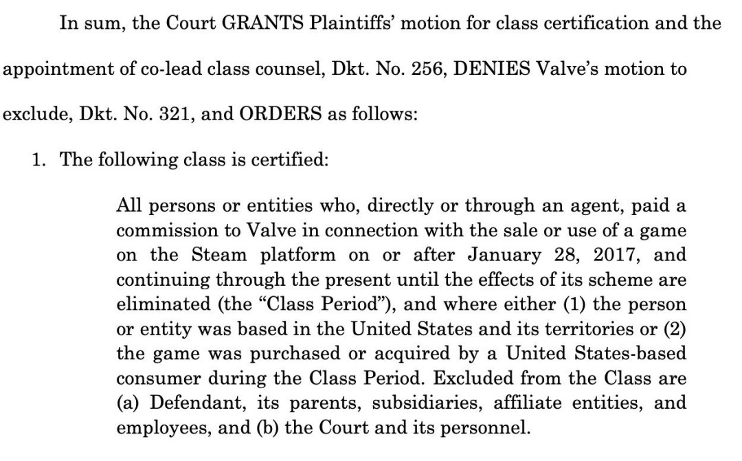 该诉讼曾被法院驳回,但允许提交修改后的诉状。2022年5月,法院认可了修改后诉状中的部分诉求,允许诉讼继续进行。随后,该案与Dark Catt Studios提起的类似诉讼合并。到了2024年11月,法院认证本案为集体诉讼,并指定Wolfire Games和Dark Catt Studios为原告代表。法院确定了原告范围:在2017年1月28日至2024年11月25日期间向Valve支付过佣金的开发商/发行商。据估计,符合条件的对象多达32,000人(或公司)。