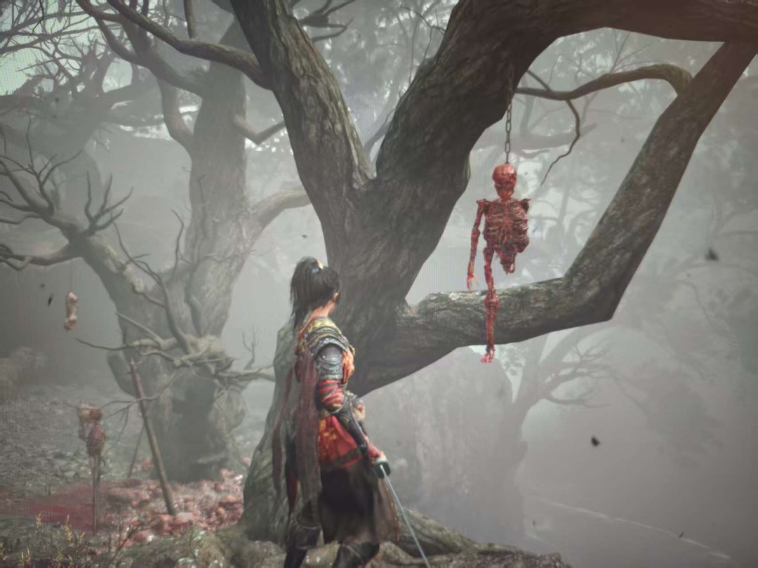 从他分享的游玩截图看,《明末:渊虚之羽》对血淋淋的尸骸毫无避讳,不仅地面上有,而且还经常被挂起,和其周围的绿色环境总感觉非常不搭。