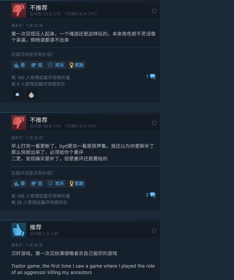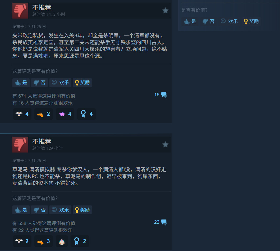 如果以上仅仅是“吹毛求疵”,那么Steam评论区反应的”夹带私货“问题就比较严重。评论区很多国人玩家反应《明末:渊虚之羽》可以随意杀死那些“说四川话的村民”,这些村民血量很低,而且不还手,整个游戏没有一个清军。甚至有玩家反应游戏中的Boss原型竟是现实中的“民族英雄”,而那些“不还手的村民是当时满清屠杀四川的时候活下来的幸存者”,丝毫没有尊重历史。