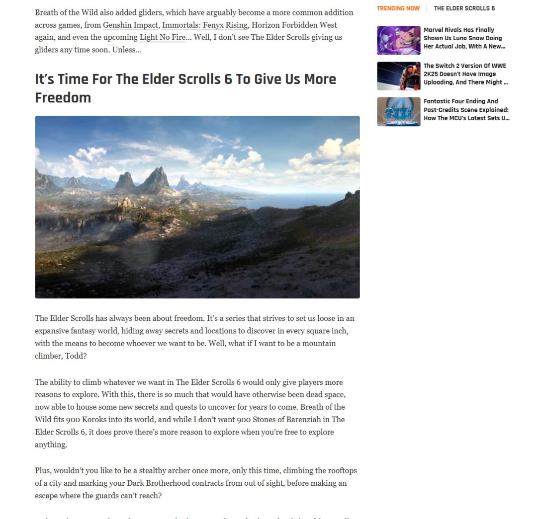以下是外媒The Gamer发布的一篇文章,作者呼吁《上古卷轴6》应引入真正意义上的“攀爬”机制,甚至像《塞尔达传说:旷野之息》那样,彻底放开探索的自由边界。