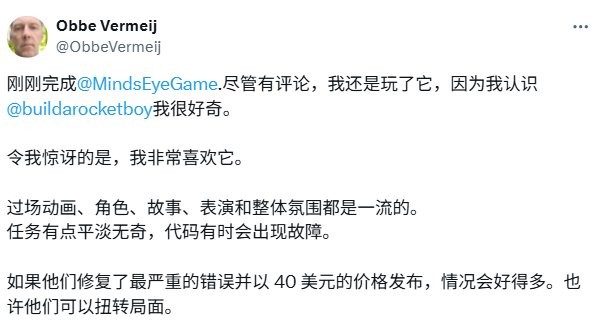 Vermeij在推特上解释了他的理由,说他发现这款游戏出人意料地好。然而,他也承认其缺陷,并指出:“如果他们修复了最严重的漏洞并以40美元的价格发售,情况本可以好得多。”