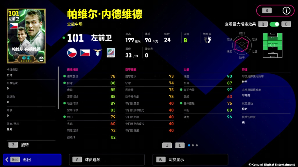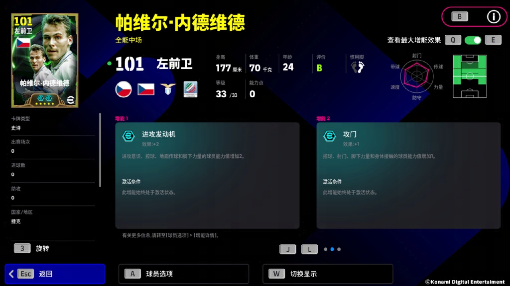内德维德增能属性为【进攻发动机 +2】,让他成为球队值得依靠的致命武器!内德维德还自带特殊技能【落叶式横传】,他能用精准的传中助攻队友完成破门!