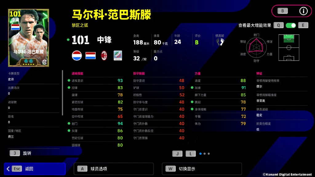 范巴斯滕增能属性为【空中对抗 +2】,身体接触和头球