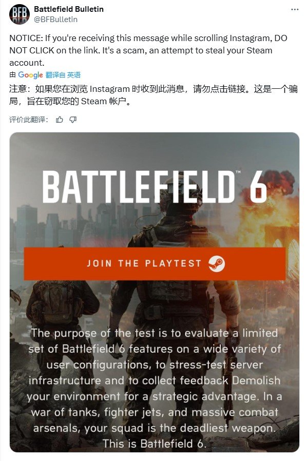 随着《战地6》预告片发布引发的热潮,不法分子开始利用玩家的期待实施诈骗。近期社交媒体上出现新型钓鱼骗局,通过伪造的《战地6》测试邀请诱导玩家泄露Steam账号信息。