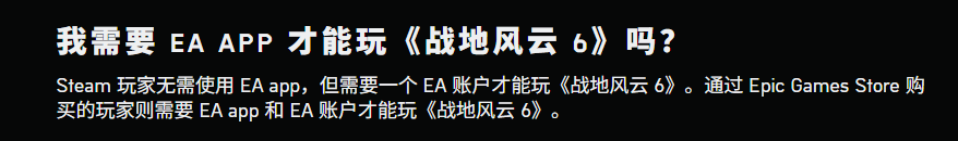 EA还表示,Steam玩家无需使用EA app,但需要一个EA账户才能玩《战地风云6》。通过Epic Games Store购买的玩家则需要EA app和EA账户才能玩《战地风云6》。