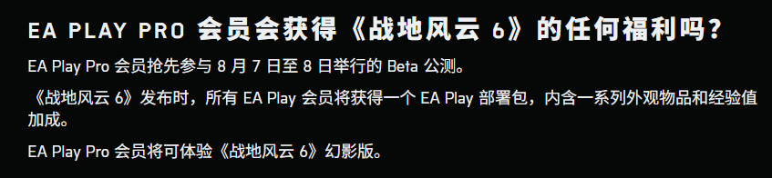 EA Play Pro会员可抢先参与8月7日至8日举行的Beta公测。《战地风云6》发布时,所有EA Play会员将获得一个EA Play部署包,内含一系列外观物品和经验值加成。EA Play Pro会员将可体验《战地风云6》幻影版。