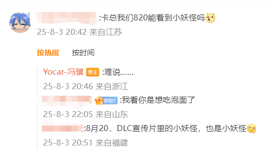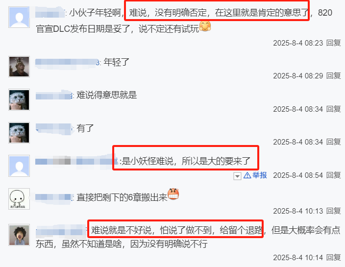 因此,绝大部分玩家都觉得DLC稳了:“难说,没有明确否定,在这里就是肯定的意思了,820官宣DLC发布日期是妥了,说不定还有试玩”,“是小妖怪难说,所以是大的要来了”,“难说就是不好说,怕说了做不到,给留个退路,但是大概率会有点东西,虽然不知道是啥,因为没有明确说不行”……