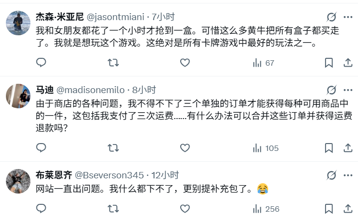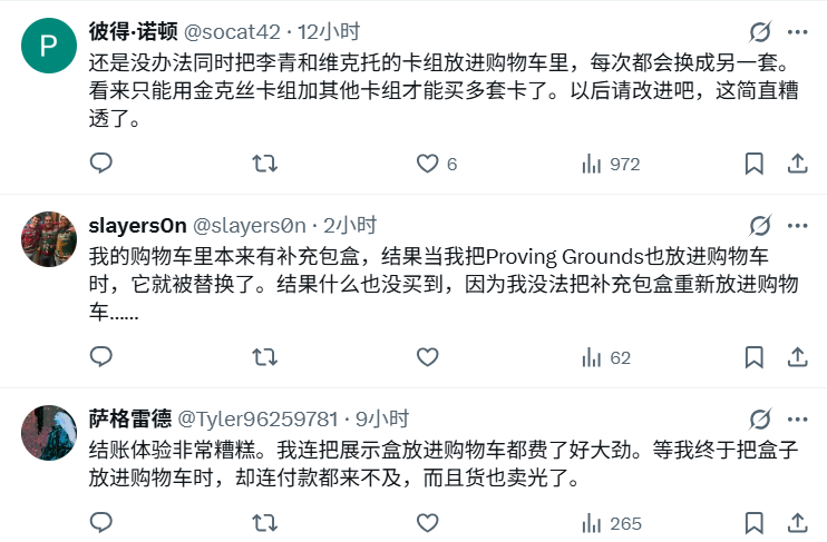 从这些玩家的抱怨来看,在英文版首发的第一时间,其预售官网就被挤爆了,这导致玩家无法将基础英雄包、拓展包、以及一些单盒全部放在一个购物车内结账,要么得多花几笔运费拿下,要么就只能终止购买。