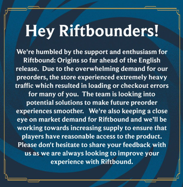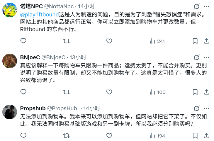 很多海外TCG卡牌爱好者对此十分不满,他们觉得这是拳头在故意搞饥饿营销,目的是炒热这个《符文战场》。因为有人发现在开启预购的第一时间,网站上的游戏周边都能正常被添加进购物车,唯独卡包会出现问题。也有一部分人觉得这是黄牛在做局,花大价钱清空了市面上的第一版卡包,以便之后炒热这些卡。