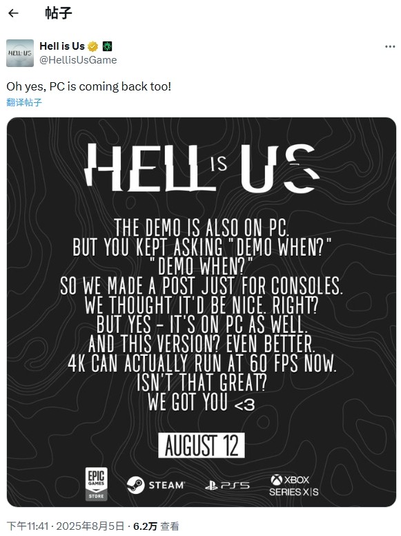 Rogue Factor宣布,其新作《地狱即我们》试玩版将在8月12日登陆PlayStation 5和Xbox Series X/S平台。同时,试玩版也将回归PC平台,并进行性能优化,支持在4K分辨率下实现60帧运行。