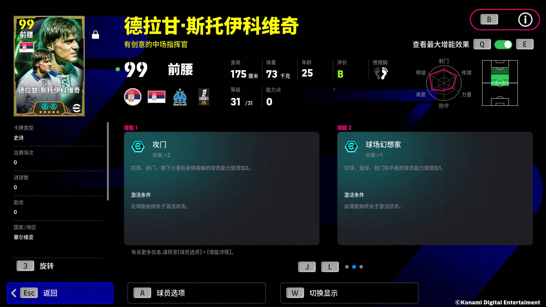 斯托伊科维奇的增能属性为【攻门 +2】,控球和射门的加强让他成为冷静的门前终结者!