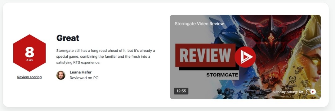 IGN总结称,《风暴之门》是一款“熟悉又新鲜”的RTS作品,虽仍有不足,但已展现出极强的竞技基础与发展潜力,令人期待其未来表现。