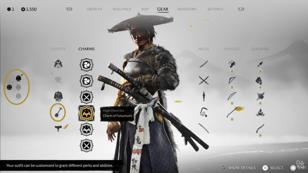 在菜单左侧,似乎能让玩家在三种预设方案间循环切换。这很可能是为节省玩家从头配置装备的时间,直接调用预设的护甲与符咒组合。该功能最初是通过更新加入《对马岛之魂》的,如今被制作团队列为重点传承要素。