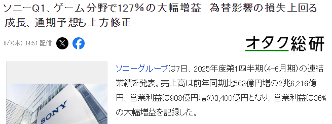 索尼集团日前公布了2025年4~6月期的公司收益情况,整体销售收入相较去年同期增长563亿日元,达到26216亿日元,整体利润达到3400亿日元,交去年同期增长36%。