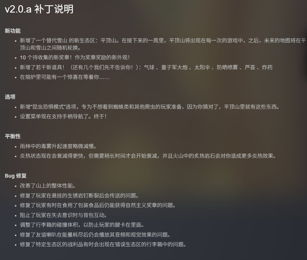 随着“平顶山”更新的到来,玩家将踏足一片“酷日之下的沙地地形”。为了在这片未知环境中生存,玩家将需要新的物品。这些物品包括:气球、侦察炮、遮阳伞、防晒霜、芦荟和炸药。玩家还将在“熔炉”区域发现一个惊喜等待揭晓。另外,游戏还新增“昆虫恐惧模式”,为不想看到蜘蛛与爬虫类的玩家准备。