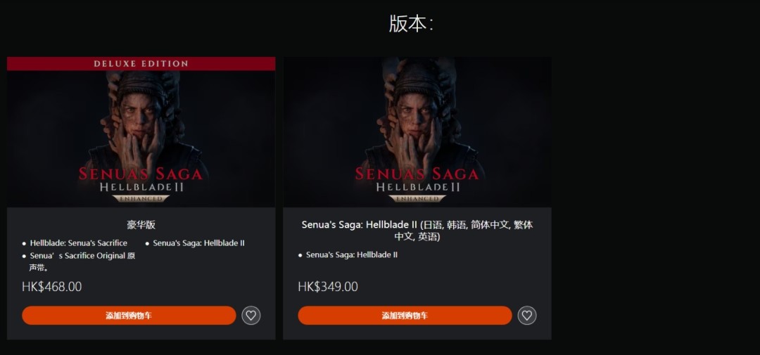 《地狱之刃:塞娜的献祭》PS4售价235港币,PS5售价297港币;《地狱之刃2:塞娜的传说》PS5标准版售价349港币,豪华版468港币。