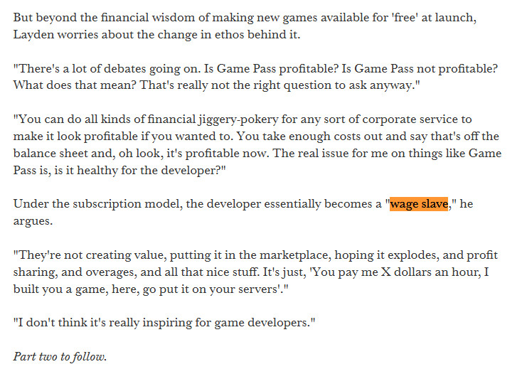 在他看来,订阅模式迫使游戏开发商本质上成为“工资奴隶”/打工仔,“他们不会想着发售后能爆火,然后参与分成、拿到额外收益、享受那些美好的事情。而是变成——‘你按小时付我钱,我帮你做个游戏,给你,拿去放到你们服务器上吧’。”