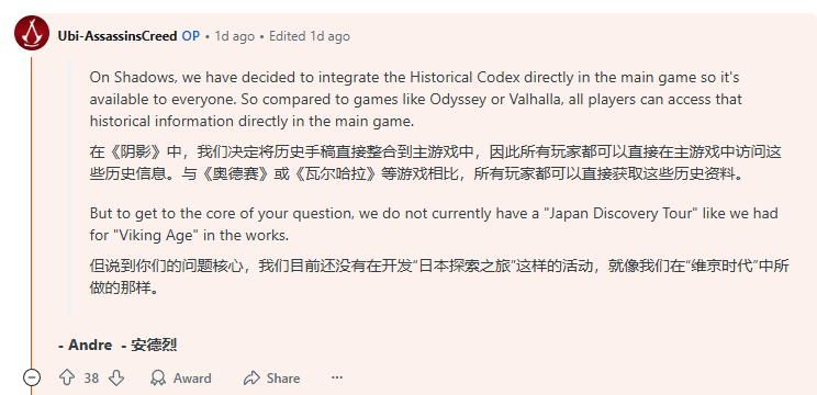 在AMA环节中,有玩家询问《刺客信条:影》是否会像《刺客信条:英灵殿》拥有“维京时代”探索之旅那样,推出一个“日本探索之旅”。对此,一位开发人员回应称:“目前没有开发类似‘维京时代’的‘日本探索之旅’的计划。”