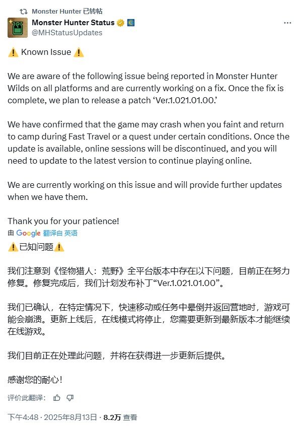卡普空官方声明称:“我们确认在特定条件下,玩家倒地并通过快速旅行返回营地时可能导致游戏崩溃。补丁上线后,在线模式将暂停服务,玩家需更新至最新版本才能继续联机。”