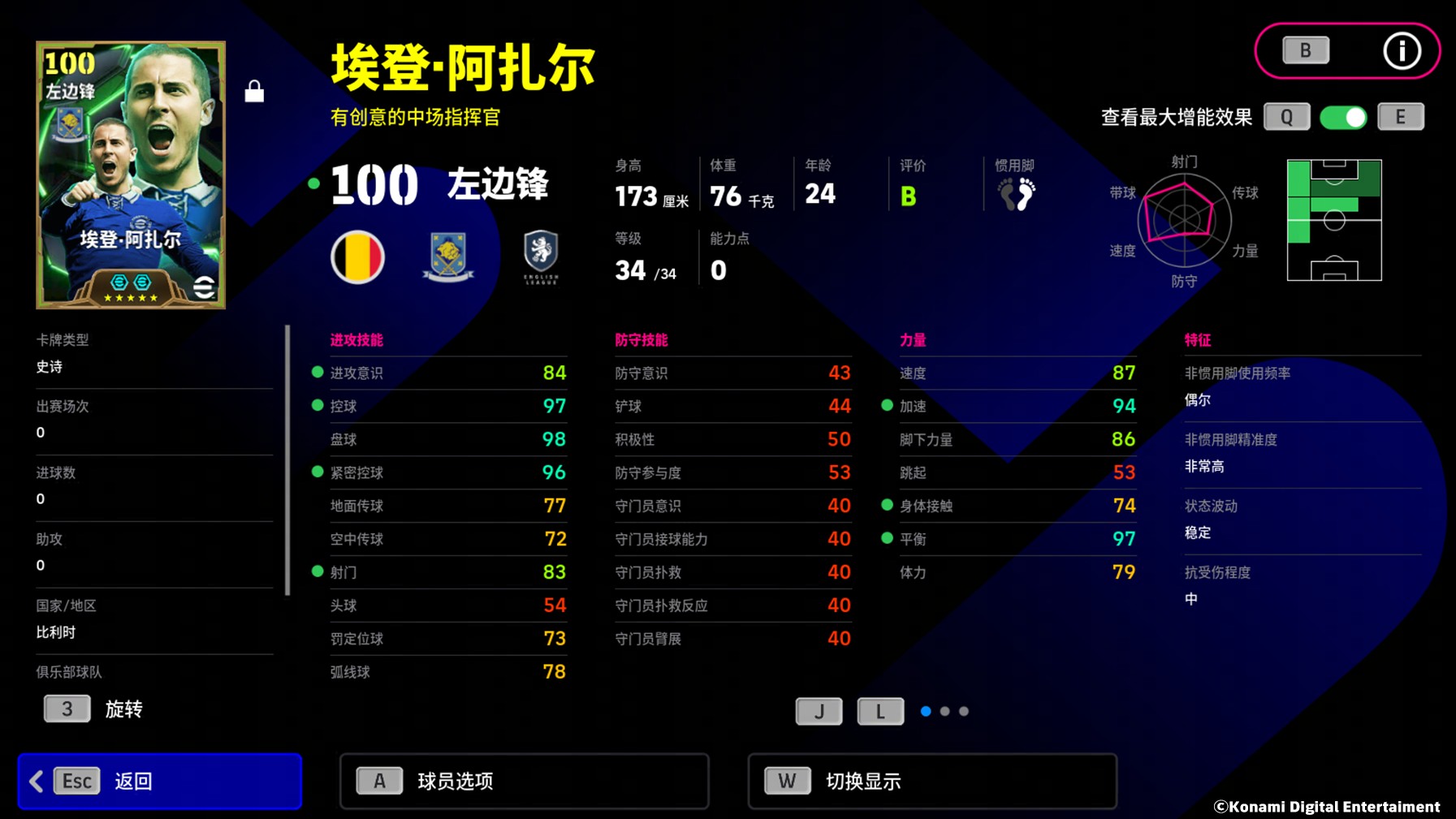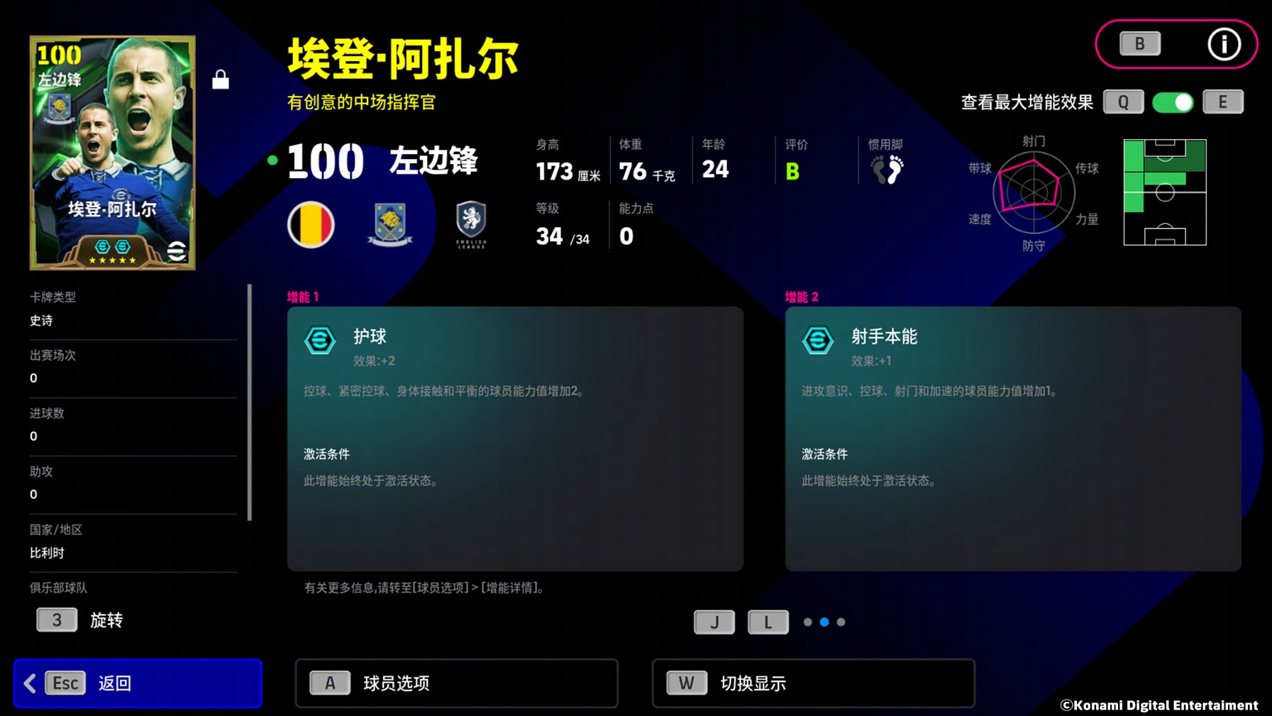 阿扎尔增能属性为【护球 +2】,控球和身体接触的加强让他在实况赛场也能上演“扛翻”对手的好戏!