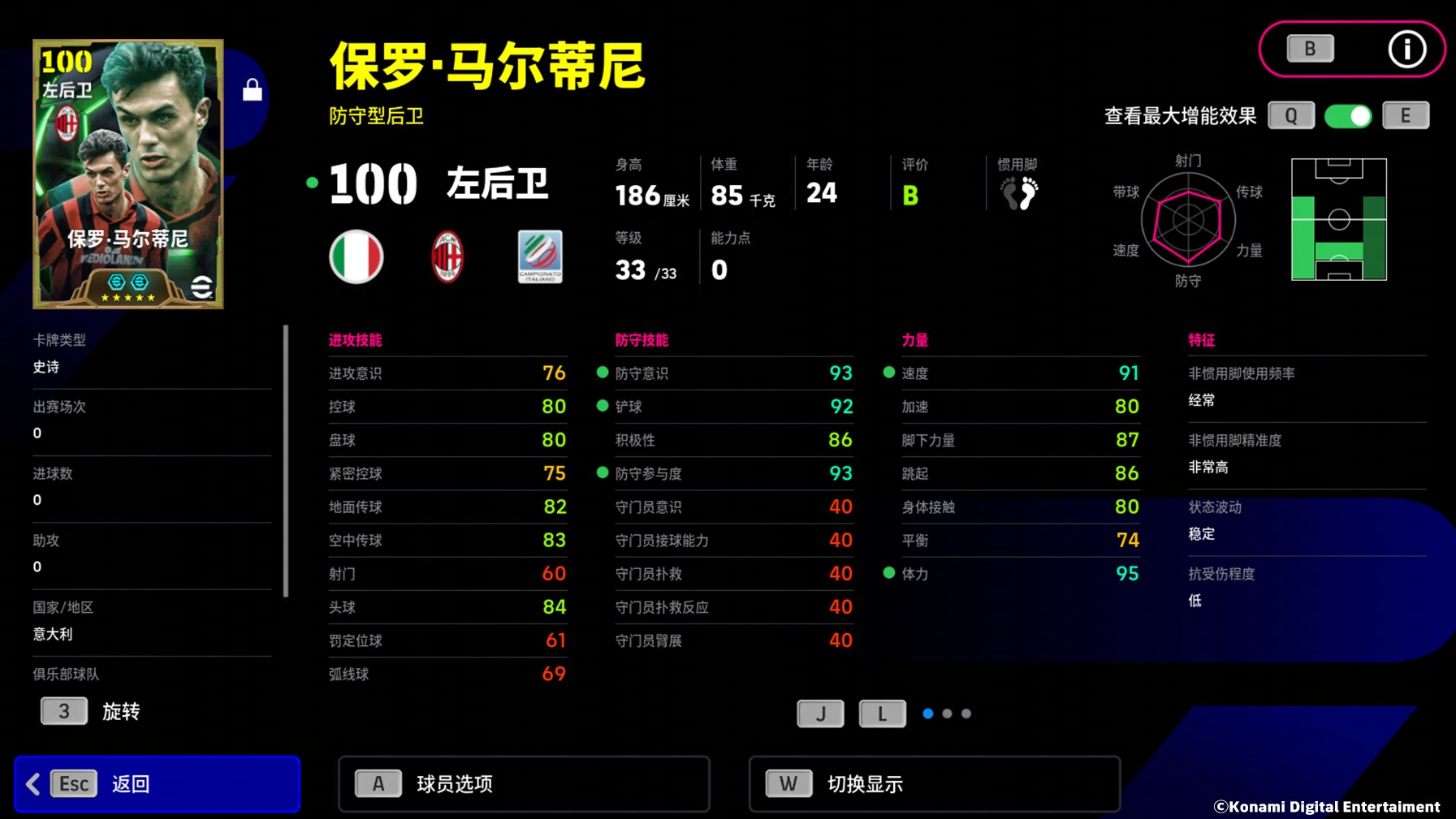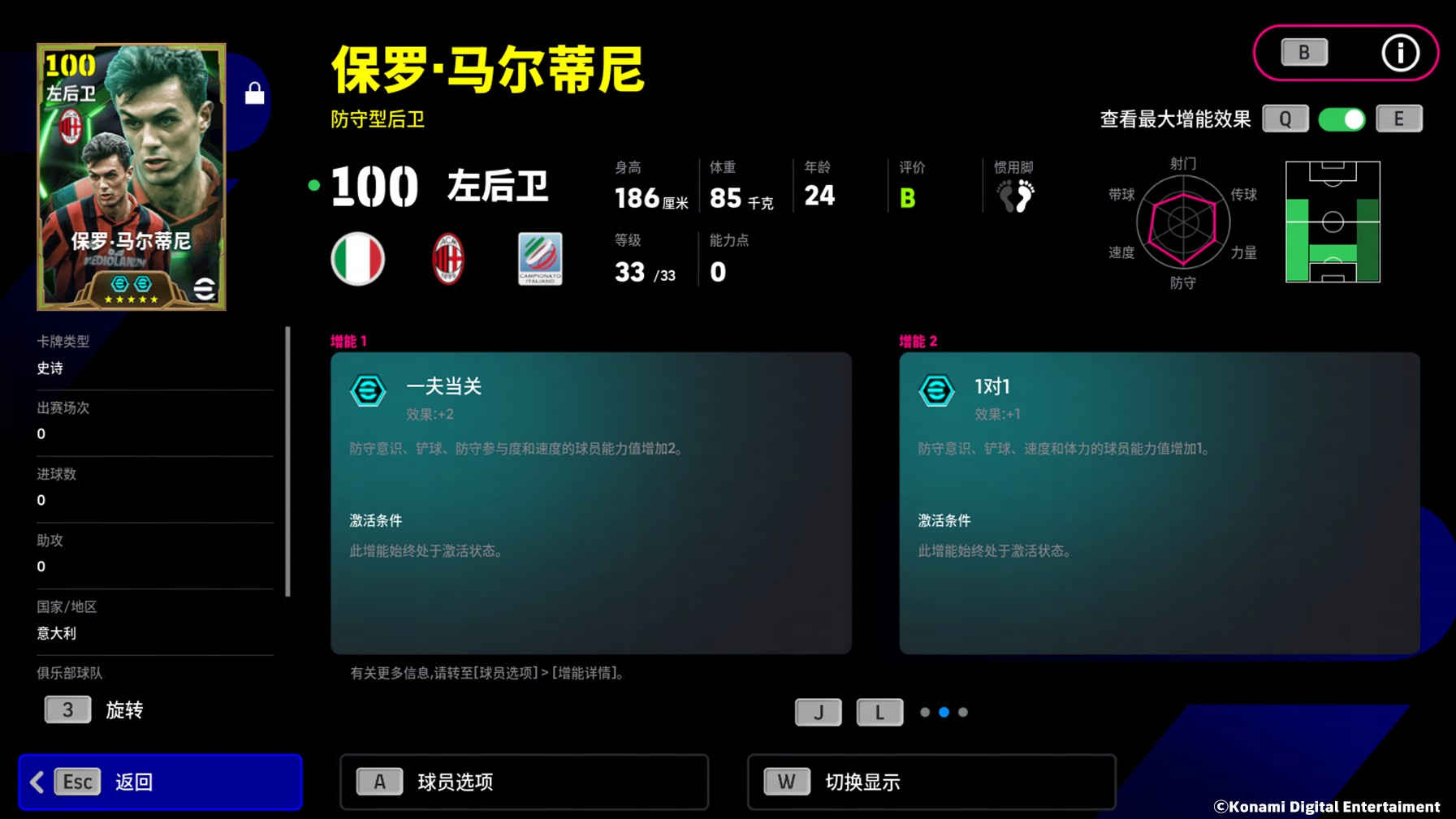 马尔蒂尼增能属性为【一夫当关 +2】,防守和速度的增强,让他成为球队左路的防守天堑!