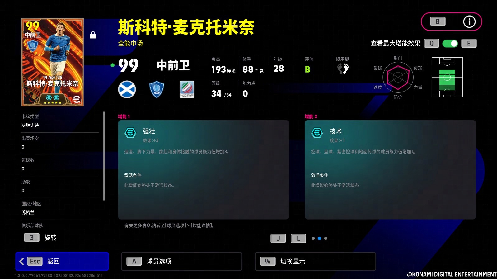 麦克托米奈增能属性为【强壮 +2】,进攻和身体接触的增强让他成为球队的中场屏障!