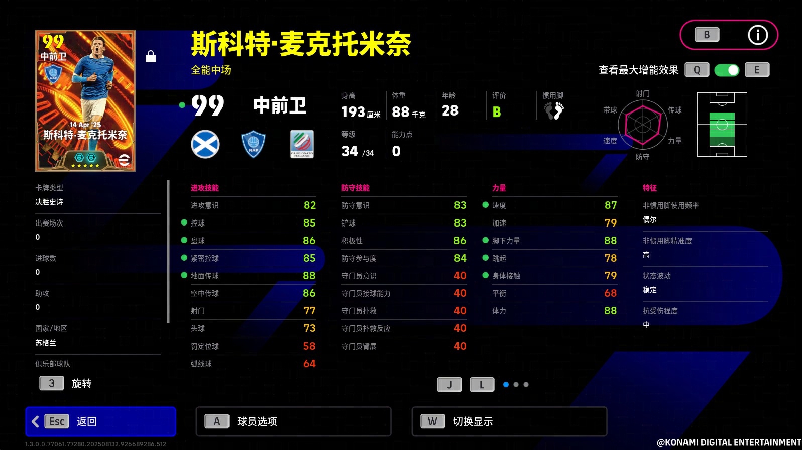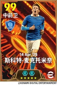 他是铁骨铮铮的中场硬汉,是攻守之间最可靠的多面战将!出身于红魔青训的麦克托米奈具备典型英式中场的强硬风格,高大强壮的体格让他在防守端坚不可摧。而来到亚平宁后,他的进攻潜力被彻底激活,无论是穿透力十足的精准直塞,还是后插上的一锤定音,他都总能在关键时刻挺身而出,成为攻防俱佳的中场杀器!
