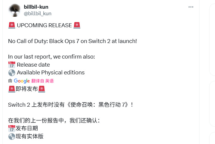 坤哥还指出,《使命召唤:黑色行动7》不会登陆任天堂Switch 2平台,这意味着今年的两大FPS游戏《战地6》和《使命召唤:黑色行动7》都无缘Switch 2,不过另外2K的刷宝射击游戏《无主之地4》将登陆NS2,10月3日发售。
