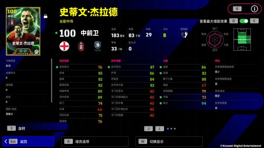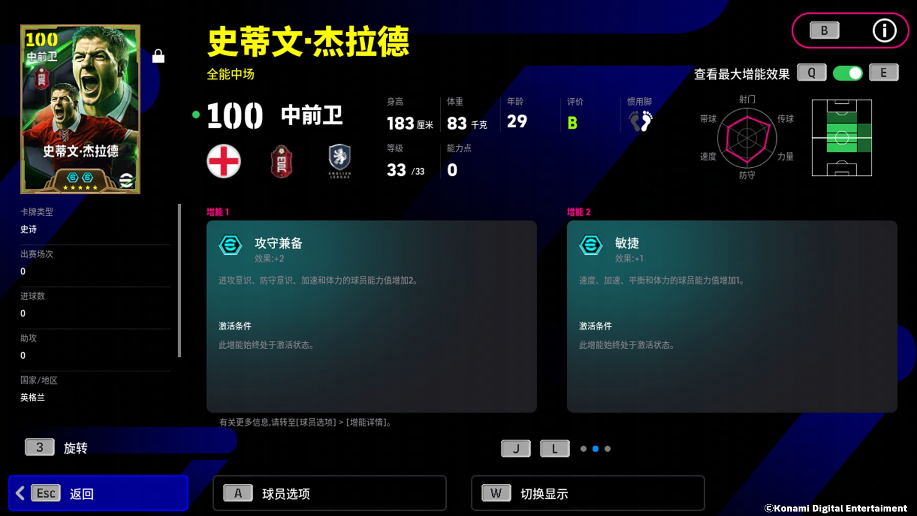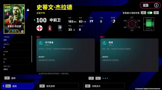 杰拉德增能属性为【攻守兼备 +2】,全面的能力让杰队在场上无所不能!