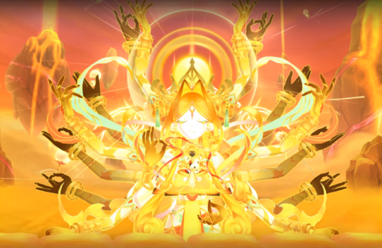 第三关卡的BOSS“流淌之火,燃烧之水”,是元素精灵王全力的形象,在副本中需要玩家相互配合,以致利用BOSS虚弱时刻进行强力打击。
